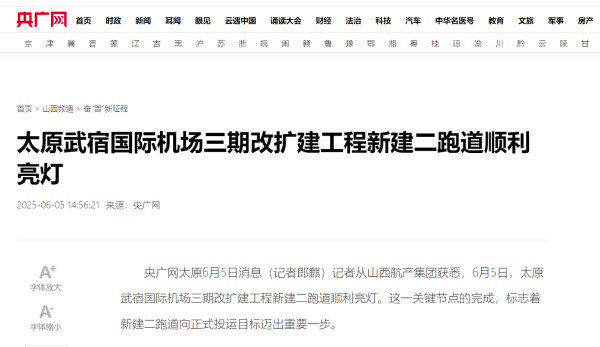 6月5日凌晨,太原武宿國際機(jī)場三期改擴(kuò)建工程新建二跑道順利亮燈。這一關(guān)鍵節(jié)點(diǎn)的完成,標(biāo)志著新建二跑道向正式投運(yùn)目標(biāo)邁出重要一步。