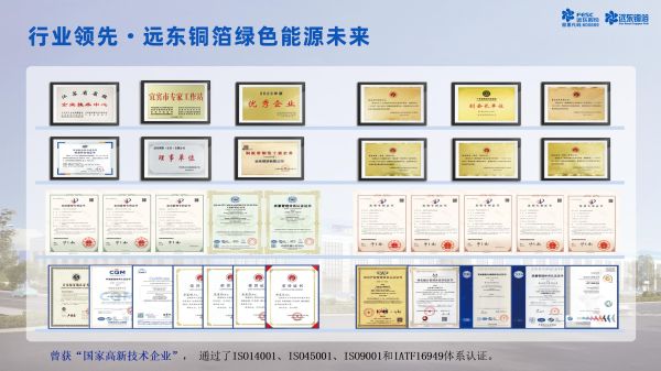能造出如此精密的產品,離不開嚴苛的制造標準和強勁的技術支撐。遠東銅箔堅持 “極致制造” 原則,通過超1000個實時監控點把控品質。憑借過硬的產品性能,公司順利通過ISO14001、IATF16949 等多項權威體系認證,拿下三十余項專利和省級科技進步獎,成功獲評高新技術企業,成為宜賓“1+N”動力電池綠色閉環全產業鏈生態圈的重要一環。