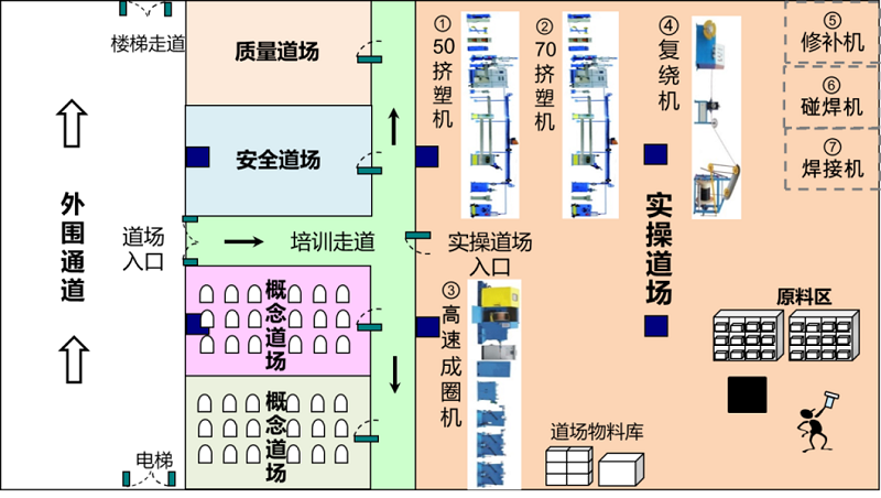 遠(yuǎn)東大學(xué)生產(chǎn)學(xué)院致力于打造行業(yè)內(nèi)首家一線員工實(shí)訓(xùn)道場,道場分為概念道場、安全培訓(xùn)區(qū)、質(zhì)量培訓(xùn)區(qū)及精益實(shí)操道場四大培訓(xùn)區(qū)域,旨在為公司培養(yǎng)具有發(fā)現(xiàn)問題、改善問題的能力、并掌握高水平實(shí)操技能的員工。概念道場即理論培訓(xùn)道場,以傳統(tǒng)課堂式、案例研討式、課題式等培訓(xùn)方式,對參訓(xùn)學(xué)員從思想認(rèn)知方面進(jìn)行工藝?yán)碚摰戎R的教學(xué);安全道場結(jié)合人、機(jī)、料、法、環(huán),設(shè)計(jì)危險(xiǎn)源識別及預(yù)防相關(guān)道具,通過安全事故案例進(jìn)行安全教育;質(zhì)量道場以質(zhì)量事故案例警示教育和質(zhì)量問題產(chǎn)品展示為主,通過系統(tǒng)性的質(zhì)量培訓(xùn),培養(yǎng)員工的質(zhì)量意識,提高員工對產(chǎn)品缺陷的識別能力;精益實(shí)操道場主要通過情景模擬教學(xué)形式,以道場內(nèi)的設(shè)備進(jìn)行設(shè)備維護(hù)、自主保養(yǎng)、快速換模、標(biāo)準(zhǔn)化作業(yè)等培訓(xùn)內(nèi)容,是員工理論培訓(xùn)與實(shí)際操作相結(jié)合的堅(jiān)實(shí)平臺。